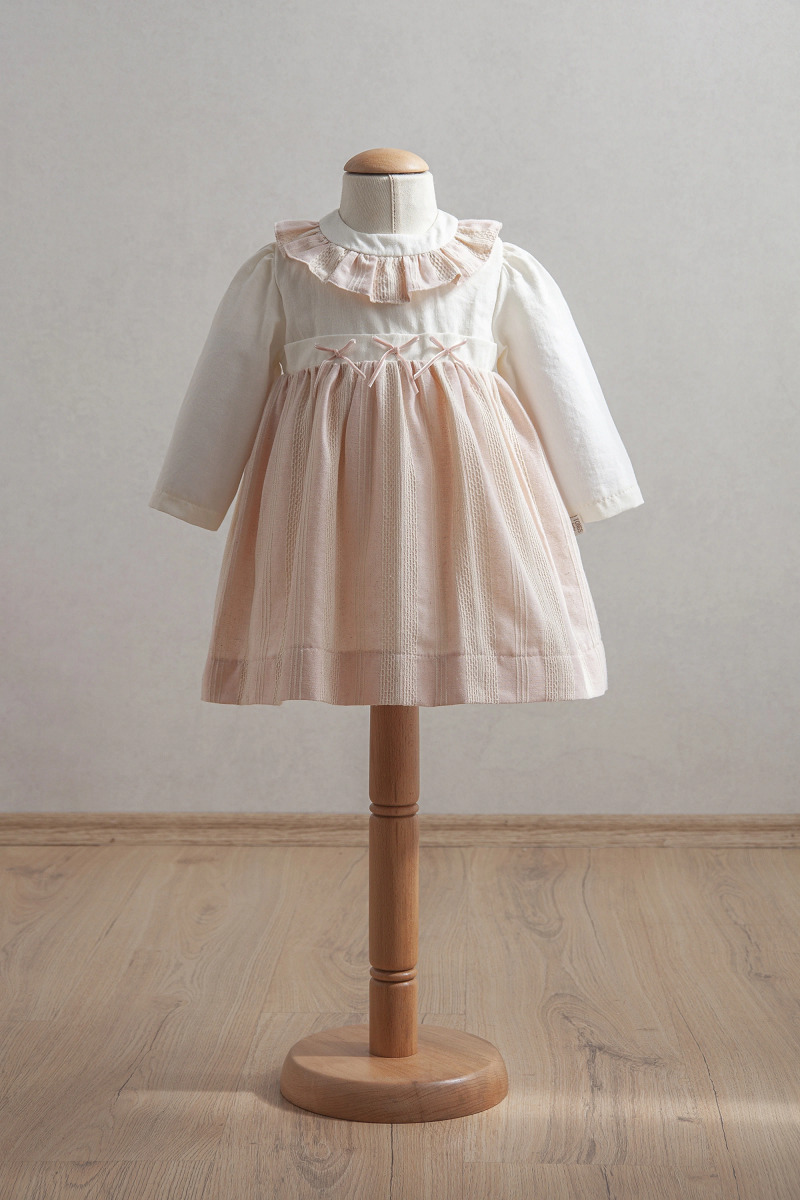 Kız bebeklere özel tasarlanan bu açık sarı ve pembe elbise, zarif detayları ve modern dokusuyla ön plana çıkıyor.