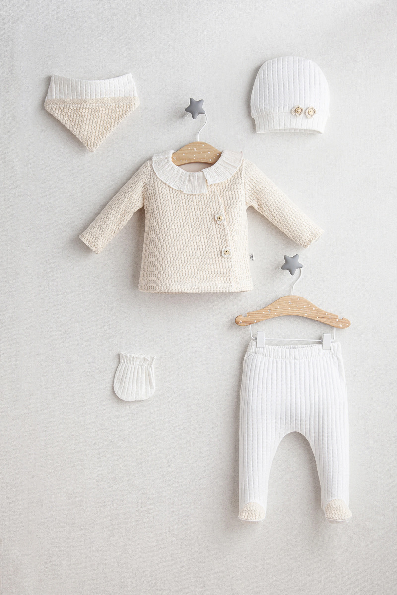 مريلة: عملية وأنيقة التصميم للحفاظ على نظافة الطفل. تفاصيل الحياكة الدقيقة لافتة للنظر. القفازات: بتصميمها الناعم والمرن، تحافظ على دفء يدي الطفل الرقيقتين وتمنع الخدوش. إغلاق الأزرار المتقاطعة على الجانب يضفي لمسة جمالية ويسهل الاستخدام. يكتمل طوق الطفل بحواف من الدانتيل وأزرار خشبية بنقوش زهرية. القماش مصنوع من 95% قطن و5% إيلاستين، وهو ناعم ومسامي، ومناسب للبشرة الحساسة. تصميم الجزء السفلي ذو القدمين يحافظ على دفء الطفل مع توفير حرية الحركة. جميع أجزاء الطقم مثالية للاستخدام اليومي والمناسبات الخاصة بتصميمها المتناسق.